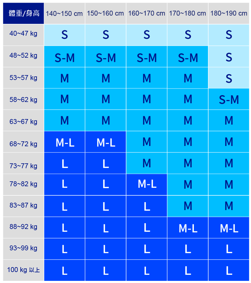 請依照身高體重選擇適合的尺寸